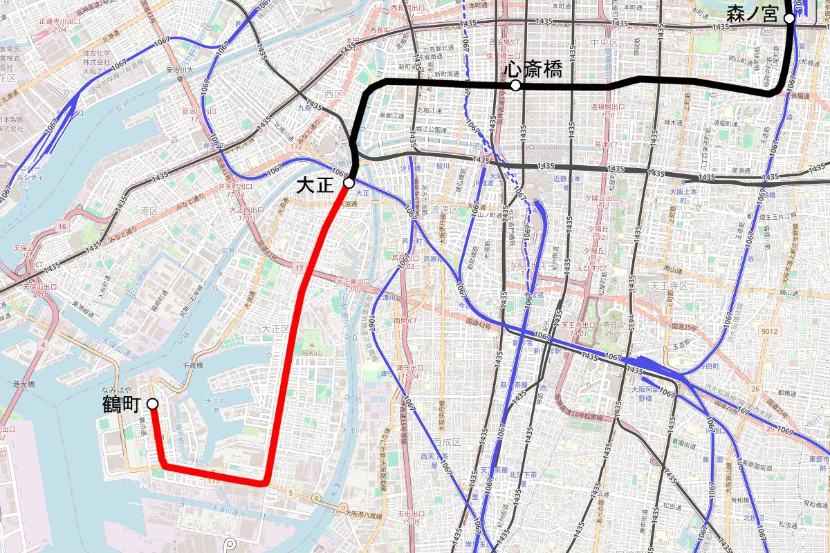 詳細なルートは固まっていない。大正駅から大阪府道の173号大阪八尾線や5号大阪港八尾線などで構成される大正通に沿って南下し、港湾部の鶴町地区に至る。